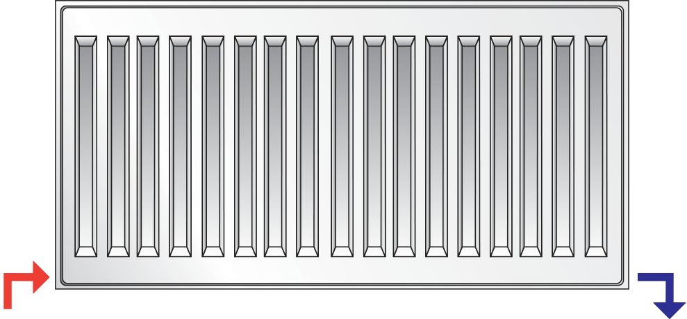 Перекрёстное подсоединение радиаторов Purmo CompactРекомендуется для радиаторов длиной более 2 000 мм, а также для тех, длина которых вчетверо превышает высоту. Питательая труба должна быть подсоединена к правому или левому верхнему штуцеру, а обратная – к противолежащему нижнему штуцеру. Подсоединение, выполненное наоборот, приведёт к снижению теплоотдачи радиатора более чем на 30%. |