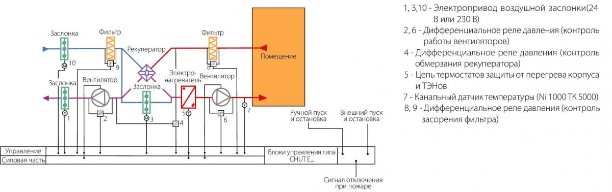 Блок управления CHUT-E30-11 предназначен для управления приточно-вытяжной установкой вентиляции с нагревателем приточного воздуха электрического типа (электрическим воздухонагревателем - калорифером).